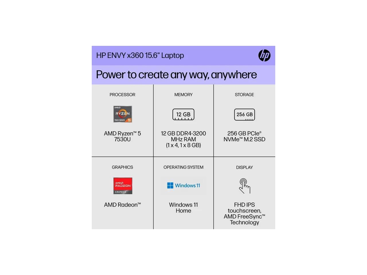 HP ENVY x360 Convertible 15.6″ FDH Touch Laptop, AMD Ryzen 5, 12GB, 256GB