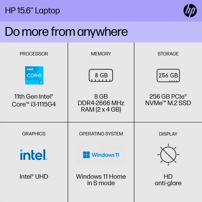 HP Laptop – Intel Core i3 – UHD Graphics – 8 GB RAM – 256 GB SSD NVMe – 15.6″ – Spruce Blue