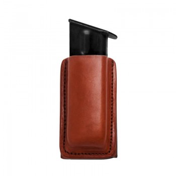 This single magazine holster features quality leather and expert stitching for a snug, secure fit. Simple, reliable open top design for easy, trouble-free in/out access. Vertical carry. Comfortable carrying, close to the body. Wrap-around design that snaps to your belt. Fits belts up to 2 ¼" wide, through belt slots. Fits most 9 mm and .45 magazines. AMBIDEXTROUS